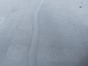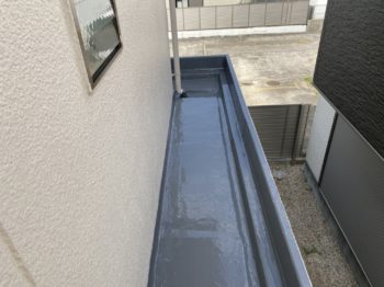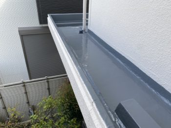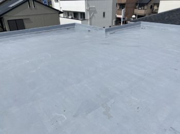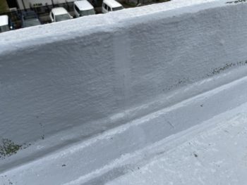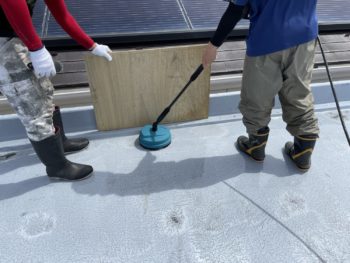 防水層の表面に所々白化した部分があります。保護塗料の劣化が始まってきているようなので、ちょうどメンテナンスのタイミングだったようです。