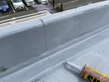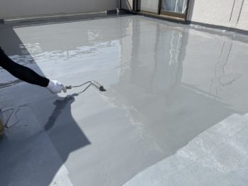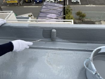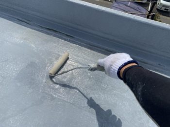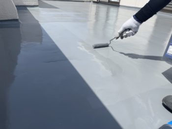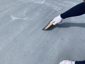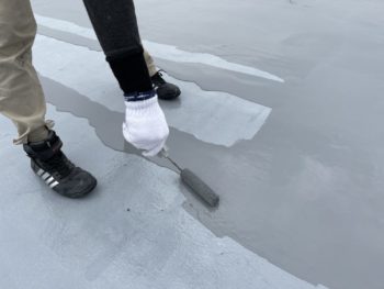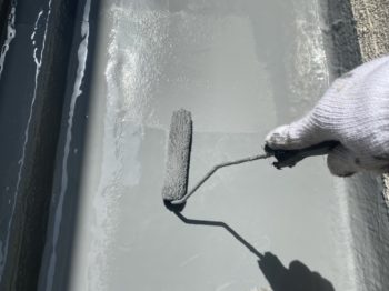 今回は、下地のひび割れも多く見られたので、ひび割れや衝撃にも強いウレア系のコーティング材を2回塗りします。